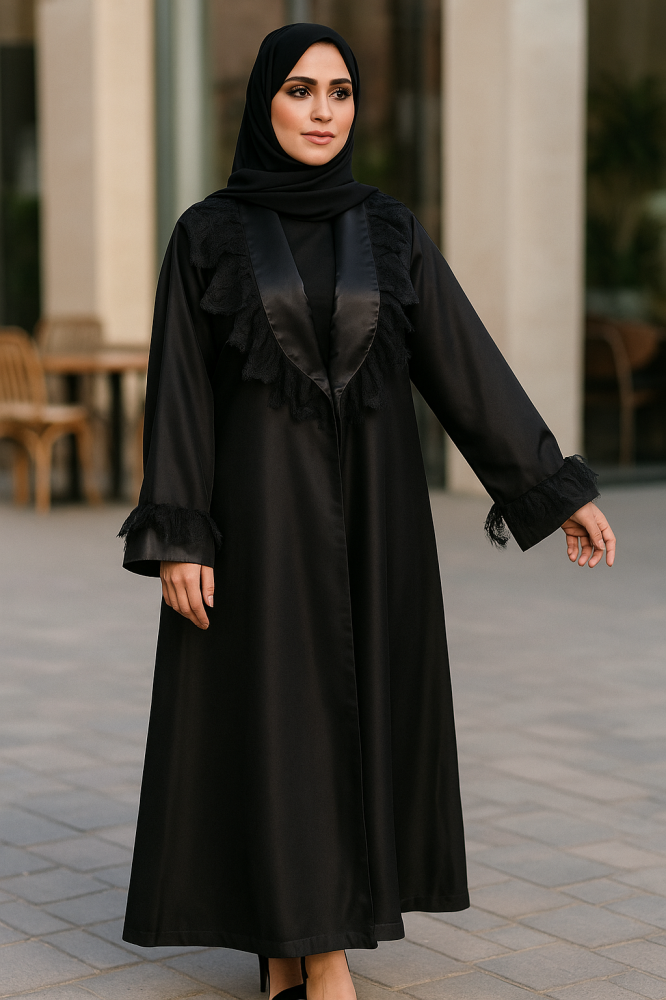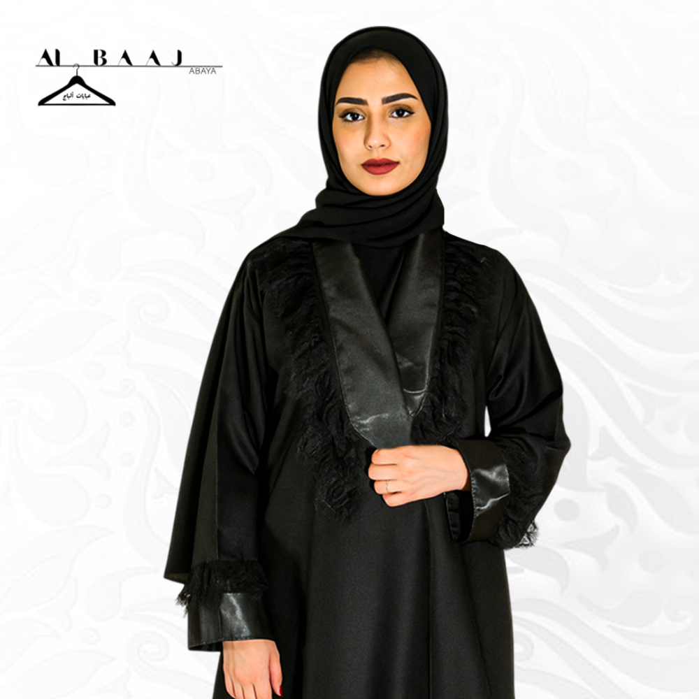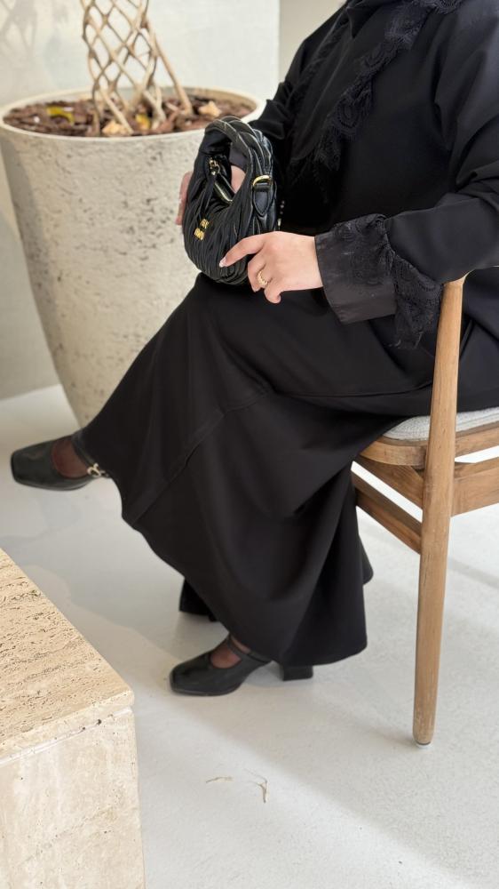 - الموديل: عباية نص كلوش بياقه وأكمام تفته.